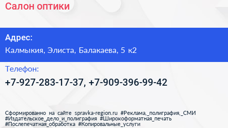 Салон оптики по адресу Калмыкия, Элиста, Балакаева, 5 к2 в дальнейшем Организация, размещена в следующих категориях: