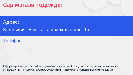 Сар, магазин одежды по адресу Калмыкия, Элиста, 7-й микрорайон, 1а в дальнейшем Организация, размещена в следующих категориях:
