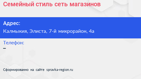 Семейный стиль, сеть магазинов по адресу Калмыкия, Элиста, 7-й микрорайон, 4а в дальнейшем Организация, размещена в следующих категориях: