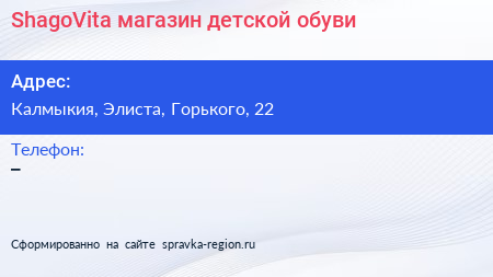 ShagoVita, магазин детской обуви по адресу Калмыкия, Элиста, Горького, 22 в дальнейшем Организация, размещена в следующих категориях: