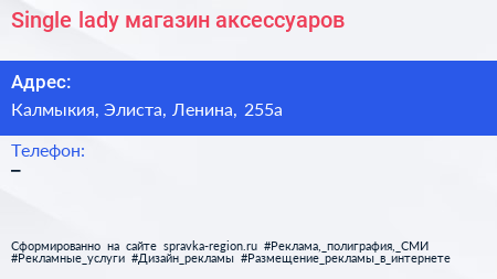 Single lady, магазин аксессуаров по адресу Калмыкия, Элиста, Ленина, 255а в дальнейшем Организация, размещена в следующих категориях: