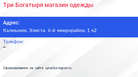 Три Богатыря, магазин одежды по адресу Калмыкия, Элиста, 6-й микрорайон, 1 к2 в дальнейшем Организация, размещена в следующих категориях:
