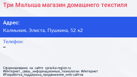 Три Малыша, магазин домашнего текстиля по адресу Калмыкия, Элиста, Пушкина, 52 к2 в дальнейшем Организация, размещена в следующих категориях:
