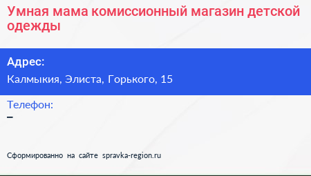 Умная мама, комиссионный магазин детской одежды по адресу Калмыкия, Элиста, Горького, 15 в дальнейшем Организация, размещена в следующих категориях: