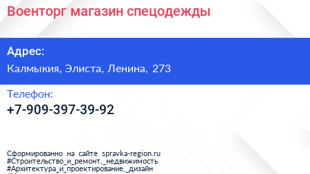 Военторг, магазин спецодежды по адресу Калмыкия, Элиста, Ленина, 273 в дальнейшем Организация, размещена в следующих категориях: