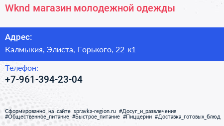 Wknd, магазин молодежной одежды по адресу Калмыкия, Элиста, Горького, 22 к1 в дальнейшем Организация, размещена в следующих категориях: