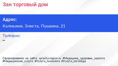 Зан, торговый дом по адресу Калмыкия, Элиста, Пушкина, 21 в дальнейшем Организация, размещена в следующих категориях: