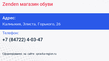 Zenden, магазин обуви по адресу Калмыкия, Элиста, Горького, 26 в дальнейшем Организация, размещена в следующих категориях: