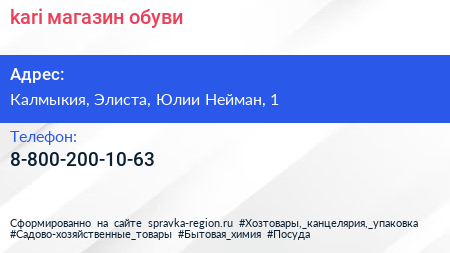 kari, магазин обуви по адресу Калмыкия, Элиста, Юлии Нейман, 1 в дальнейшем Организация, размещена в следующих категориях: