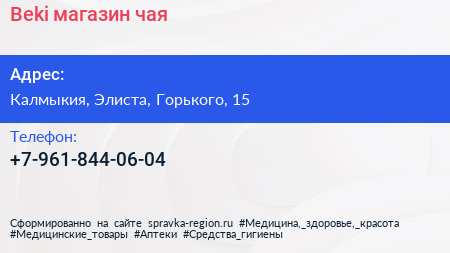 Beki, магазин чая по адресу Калмыкия, Элиста, Горького, 15 в дальнейшем Организация, размещена в следующих категориях: