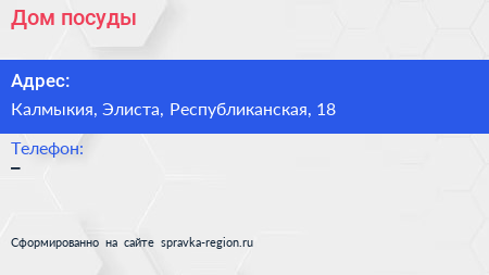 Дом посуды по адресу Калмыкия, Элиста, Республиканская, 18 в дальнейшем Организация, размещена в следующих категориях: