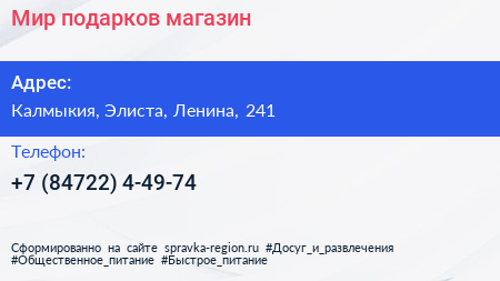 Мир подарков, магазин по адресу Калмыкия, Элиста, Ленина, 241 в дальнейшем Организация, размещена в следующих категориях:
