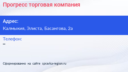 Прогресс, торговая компания по адресу Калмыкия, Элиста, Басангова, 2а в дальнейшем Организация, размещена в следующих категориях: