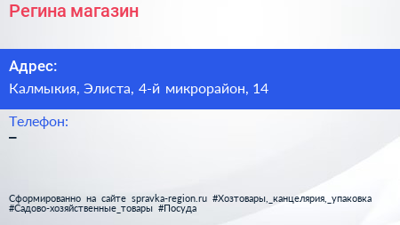 Регина, магазин по адресу Калмыкия, Элиста, 4-й микрорайон, 14 в дальнейшем Организация, размещена в следующих категориях: