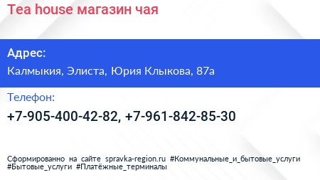 Tea house, магазин чая по адресу Калмыкия, Элиста, Юрия Клыкова, 87а в дальнейшем Организация, размещена в следующих категориях: