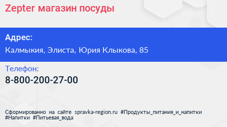 Zepter, магазин посуды по адресу Калмыкия, Элиста, Юрия Клыкова, 85 в дальнейшем Организация, размещена в следующих категориях: