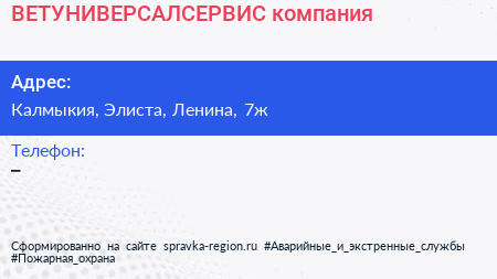 ВЕТУНИВЕРСАЛСЕРВИС, компания по адресу Калмыкия, Элиста, Ленина, 7ж в дальнейшем Организация, размещена в следующих категориях: