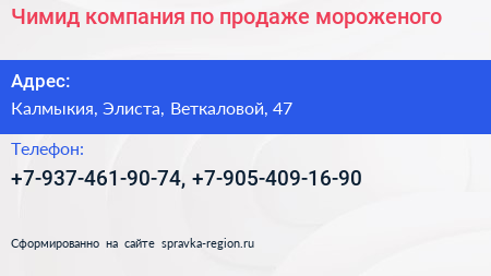 Чимид, компания по продаже мороженого по адресу Калмыкия, Элиста, Веткаловой, 47 в дальнейшем Организация, размещена в следующих категориях: