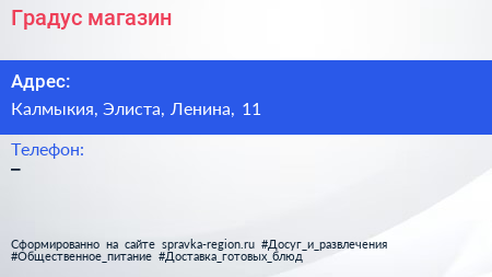 Градус, магазин по адресу Калмыкия, Элиста, Ленина, 11 в дальнейшем Организация, размещена в следующих категориях: