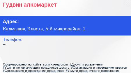 Гудвин, алкомаркет по адресу Калмыкия, Элиста, 6-й микрорайон, 1 в дальнейшем Организация, размещена в следующих категориях:
