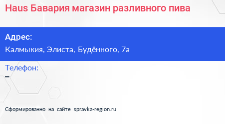 Haus Бавария, магазин разливного пива по адресу Калмыкия, Элиста, Будённого, 7а в дальнейшем Организация, размещена в следующих категориях: