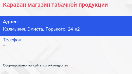 Караван, магазин табачной продукции по адресу Калмыкия, Элиста, Горького, 24 к2 в дальнейшем Организация, размещена в следующих категориях: