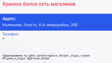 Красное & Белое, сеть магазинов по адресу Калмыкия, Элиста, 8-й микрорайон, 20Б в дальнейшем Организация, размещена в следующих категориях: