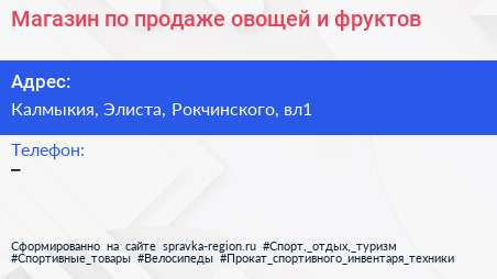 Магазин по продаже овощей и фруктов по адресу Калмыкия, Элиста, Рокчинского, вл1 в дальнейшем Организация, размещена в следующих категориях:
