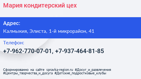Мария, кондитерский цех по адресу Калмыкия, Элиста, 1-й микрорайон, 41 в дальнейшем Организация, размещена в следующих категориях: