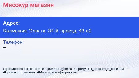 Мясокур, магазин по адресу Калмыкия, Элиста, 34-й проезд, 43 к2 в дальнейшем Организация, размещена в следующих категориях: