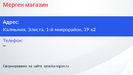Мерген, магазин по адресу Калмыкия, Элиста, 1-й микрорайон, 39 к2 в дальнейшем Организация, размещена в следующих категориях: