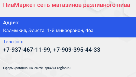 ПивМаркет, сеть магазинов разливного пива по адресу Калмыкия, Элиста, 1-й микрорайон, 46а в дальнейшем Организация, размещена в следующих категориях: