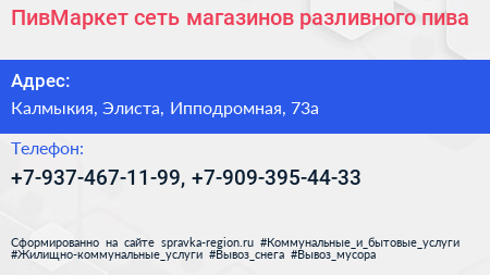 ПивМаркет, сеть магазинов разливного пива по адресу Калмыкия, Элиста, Ипподромная, 73а в дальнейшем Организация, размещена в следующих категориях: