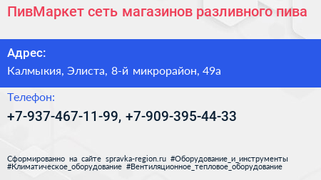 ПивМаркет, сеть магазинов разливного пива по адресу Калмыкия, Элиста, 8-й микрорайон, 49а в дальнейшем Организация, размещена в следующих категориях: