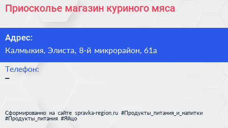 Приосколье, магазин куриного мяса по адресу Калмыкия, Элиста, 8-й микрорайон, 61а в дальнейшем Организация, размещена в следующих категориях: