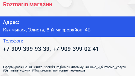 Rozmarin, магазин по адресу Калмыкия, Элиста, 8-й микрорайон, 4Б в дальнейшем Организация, размещена в следующих категориях: