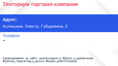 Тенториум, торговая компания по адресу Калмыкия, Элиста, Губаревича, 2 в дальнейшем Организация, размещена в следующих категориях: