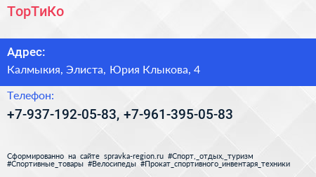 ТорТиКо по адресу Калмыкия, Элиста, Юрия Клыкова, 4 в дальнейшем Организация, размещена в следующих категориях: