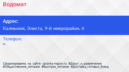 Водомат по адресу Калмыкия, Элиста, 9-й микрорайон, 4 в дальнейшем Организация, размещена в следующих категориях: