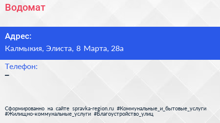 Водомат по адресу Калмыкия, Элиста, 8 Марта, 28а в дальнейшем Организация, размещена в следующих категориях: