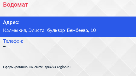 Водомат по адресу Калмыкия, Элиста, бульвар Бембеева, 10 в дальнейшем Организация, размещена в следующих категориях: