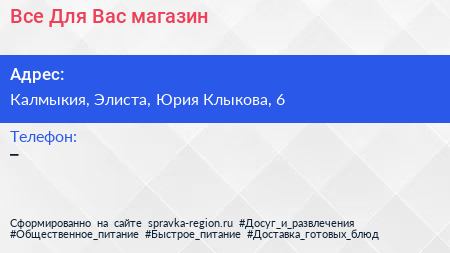 Все Для Вас, магазин по адресу Калмыкия, Элиста, Юрия Клыкова, 6 в дальнейшем Организация, размещена в следующих категориях: