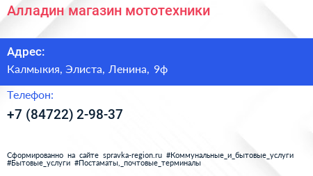 Алладин, магазин мототехники по адресу Калмыкия, Элиста, Ленина, 9ф в дальнейшем Организация, размещена в следующих категориях:
