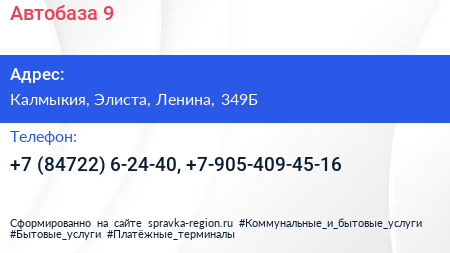 Автобаза-9 по адресу Калмыкия, Элиста, Ленина, 349Б в дальнейшем Организация, размещена в следующих категориях:
