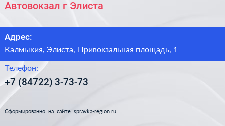 Автовокзал, г. Элиста по адресу Калмыкия, Элиста, Привокзальная площадь, 1 в дальнейшем Организация, размещена в следующих категориях: