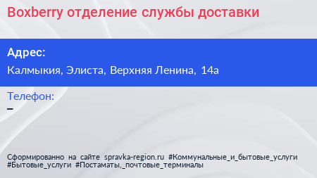 Boxberry, отделение службы доставки по адресу Калмыкия, Элиста, Верхняя Ленина, 14а в дальнейшем Организация, размещена в следующих категориях:
