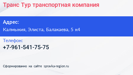 Транс-Тур, транспортная компания по адресу Калмыкия, Элиста, Балакаева, 5 к4 в дальнейшем Организация, размещена в следующих категориях: