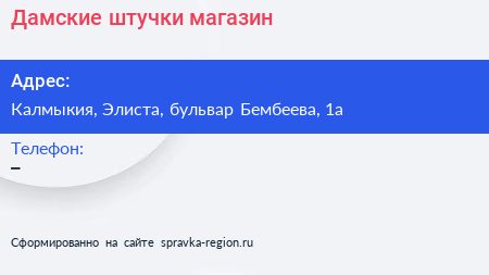 Дамские штучки, магазин по адресу Калмыкия, Элиста, бульвар Бембеева, 1а в дальнейшем Организация, размещена в следующих категориях: