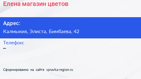 Елена, магазин цветов по адресу Калмыкия, Элиста, Бимбаева, 42 в дальнейшем Организация, размещена в следующих категориях: