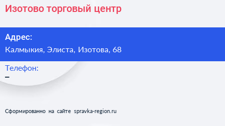 Изотово, торговый центр по адресу Калмыкия, Элиста, Изотова, 68 в дальнейшем Организация, размещена в следующих категориях: